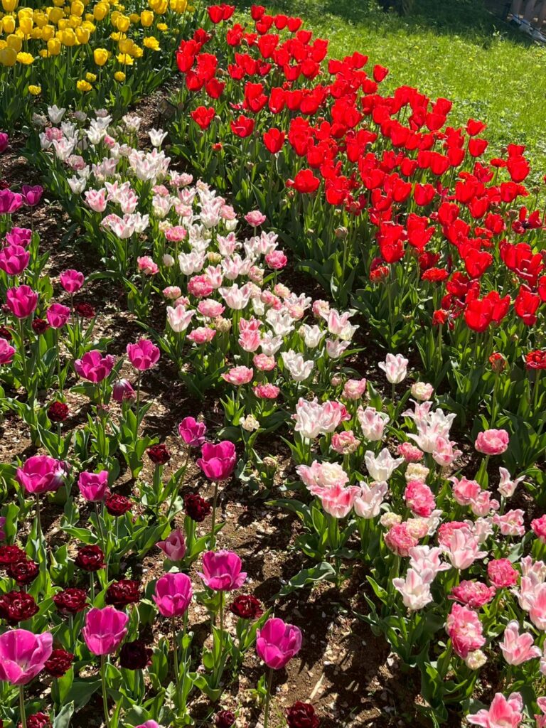 広い花畑に、赤・黄色・ピンク・白など、たくさんの色のチューリップが並びます。